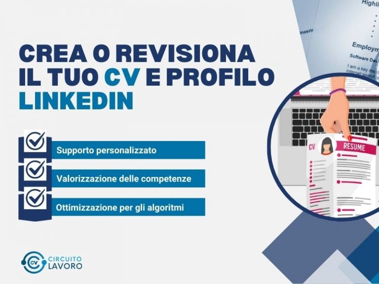 I consulenti di Circuito Lavoro sono specialisti qualificati nel settore delle risorse umane e sanno come rendere il tuo CV e il tuo profilo LinkedIn competitivi in un mercato in continua evoluzione. La loro conoscenza approfondita delle dinamiche di reclutamento ti garantirà un servizio all’altezza delle tue aspettative.